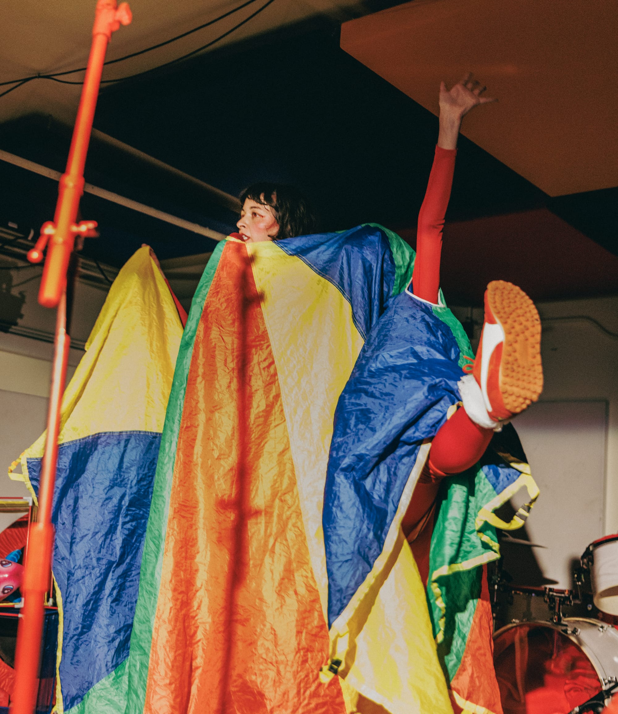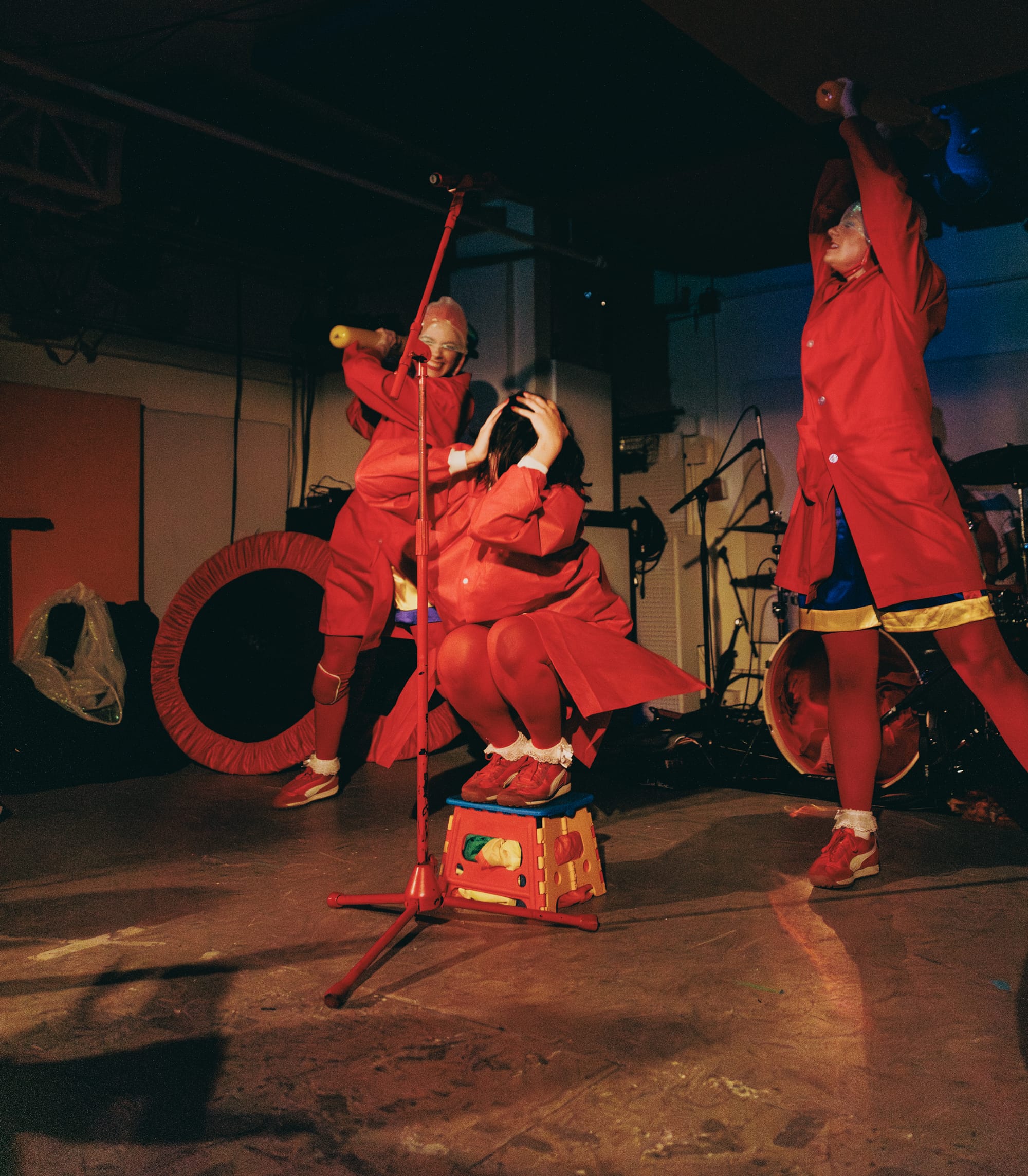 She built the show – its choreography, costumes, instrumentation, and props – with a few close collaborators. Sienna Kresge, known on stage as “SiSi” Haha, was the next to enter the orbit of the Gelliverse. Kresge choreographed and created costumes, like the dancers’ bonnets and belts. “One of the first things I wanted to do was the mini trampoline,” Abaya says. “I think that was an anchor in the show for me. And that was the first thing [Kresge and I] choreographed, the trampolines in ‘Bounce House.’”