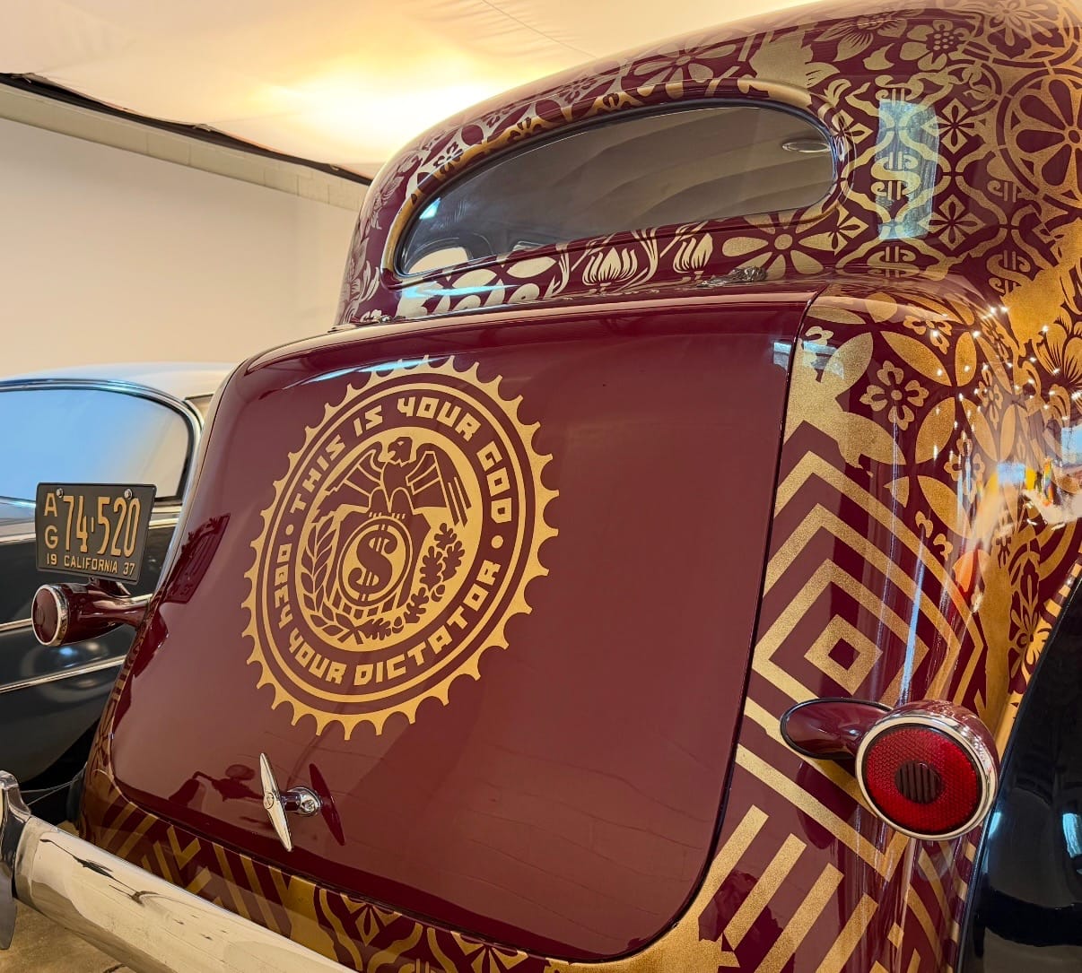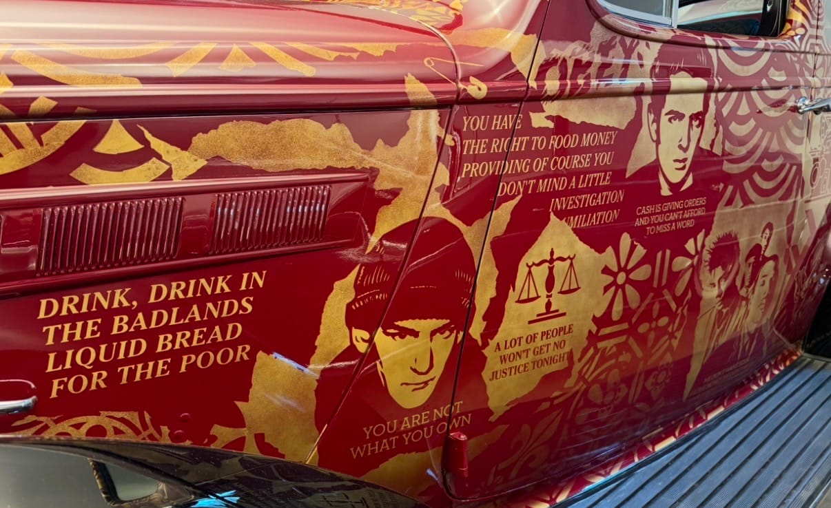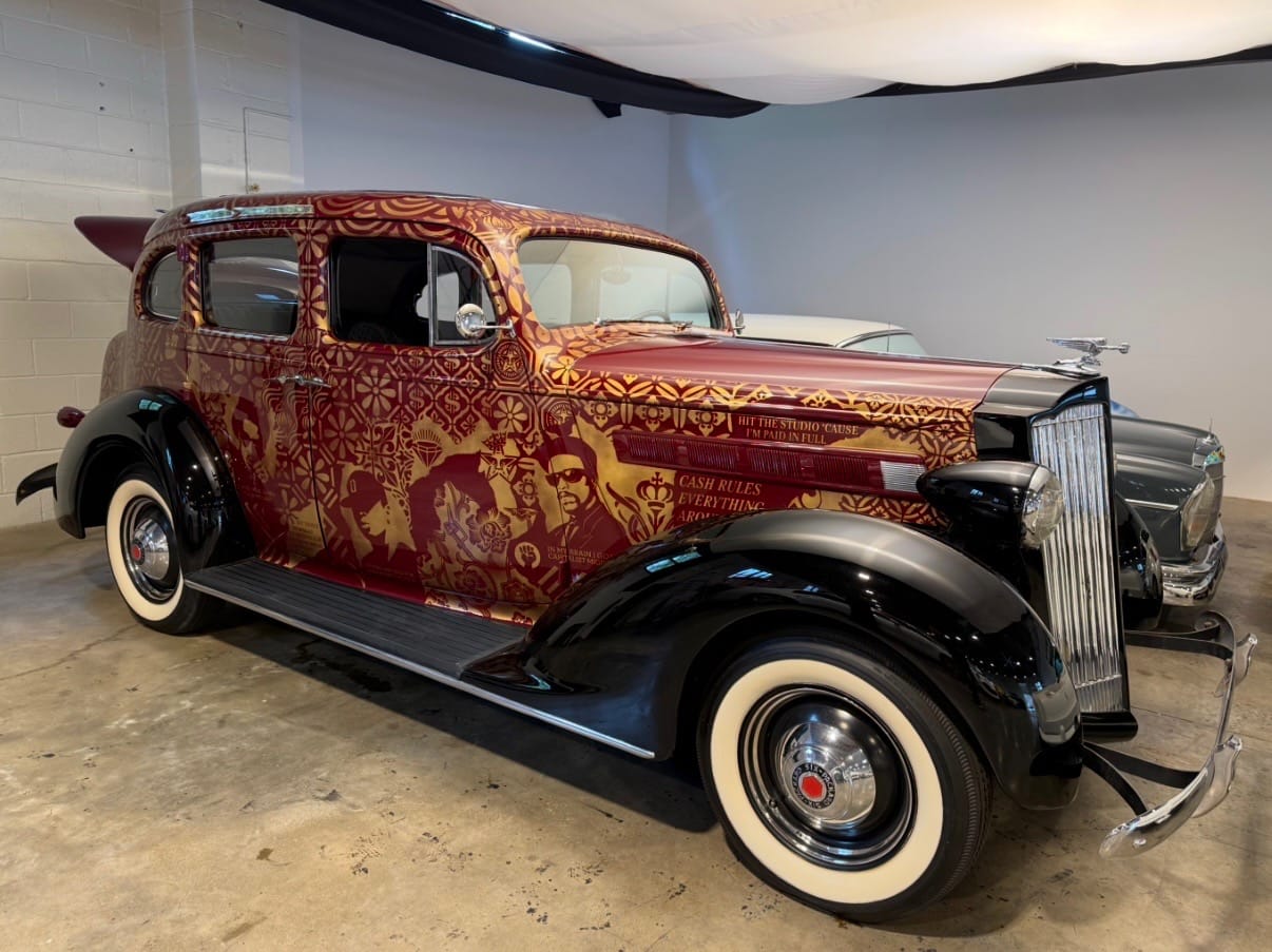 Tell me a bit more about Shepard Fairey’s 1937 Packard, which features lyrics from hip-hop on one side, punk on the other. [Listen to the playlist Shepard curated for his car below.]