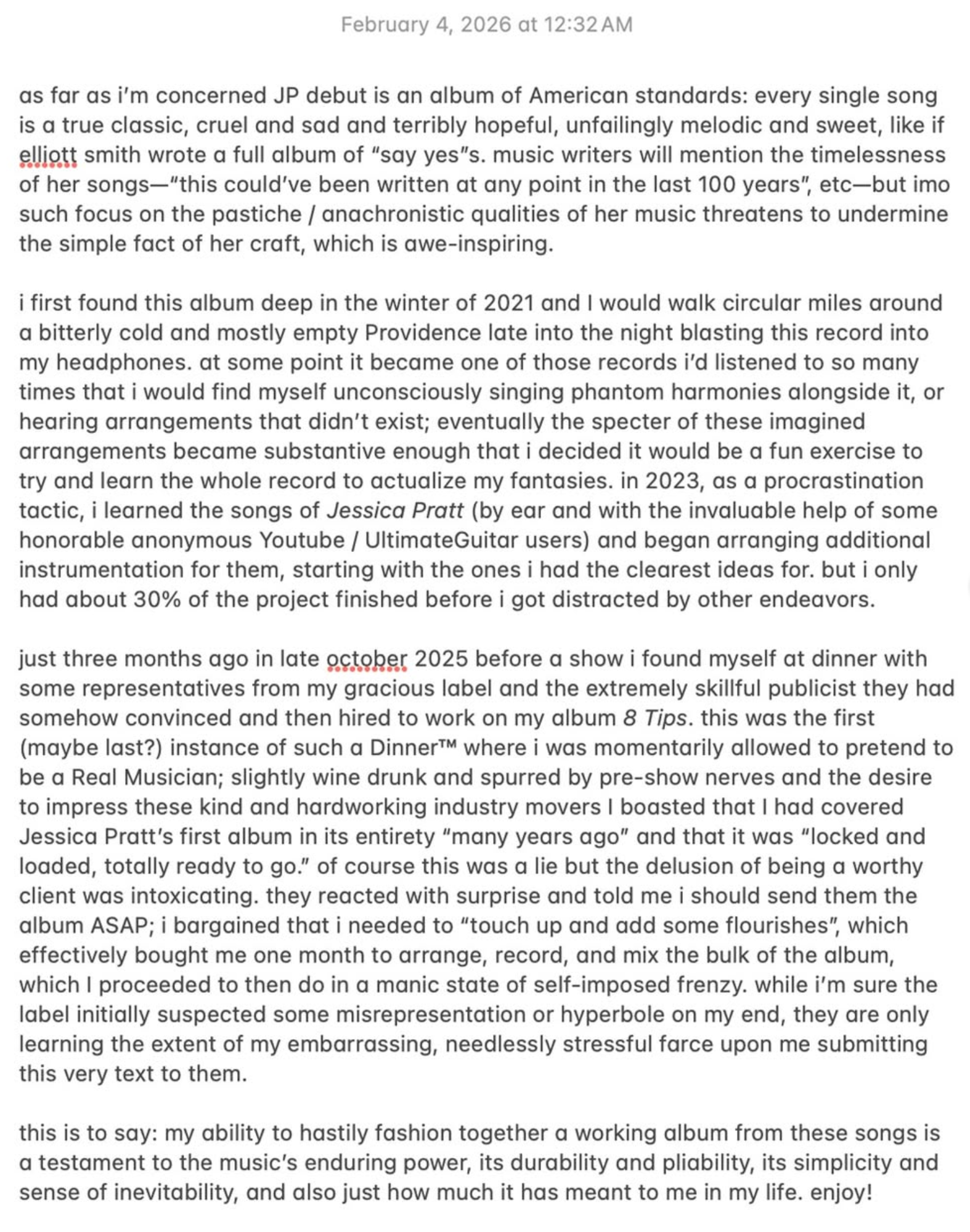 What started out in 2023 as a project born out of procrastination has now become, by way of "a manic state of self-imposed frenzy," a fully-realized record that comes with Pratt's own seal of approval. "White’s curiously inventive renditions took me by surprise," she says in a press release. "A broad sweep stylistically and production-wise. Not just homage but a record in its own right."