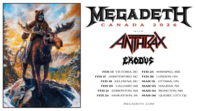 Coming up next for Megadeth, Mustaine and company kick off their farewell tour in North America with a cross-country headlining tour of Canada, launching on February 15 in Victoria, British Columbia, and including stops in Calgary, Winnipeg, and Ottawa, before wrapping up on March 6 in Quebec City, Quebec.