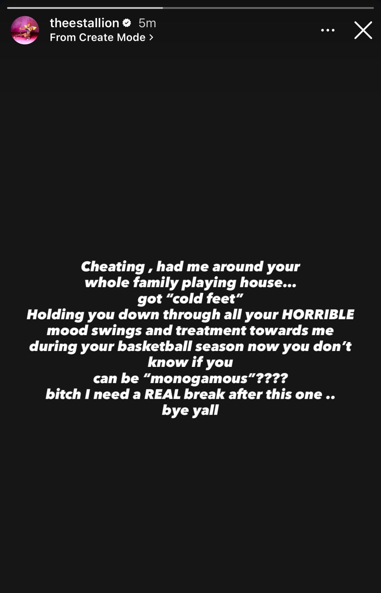 “Cheating, had me around your whole family playing house... got 'cold feet' ... Holding you down through all your HORRIBLE mood swings and treatment towards me during your basketball season now you don't know if you can be 'monogamous'????
