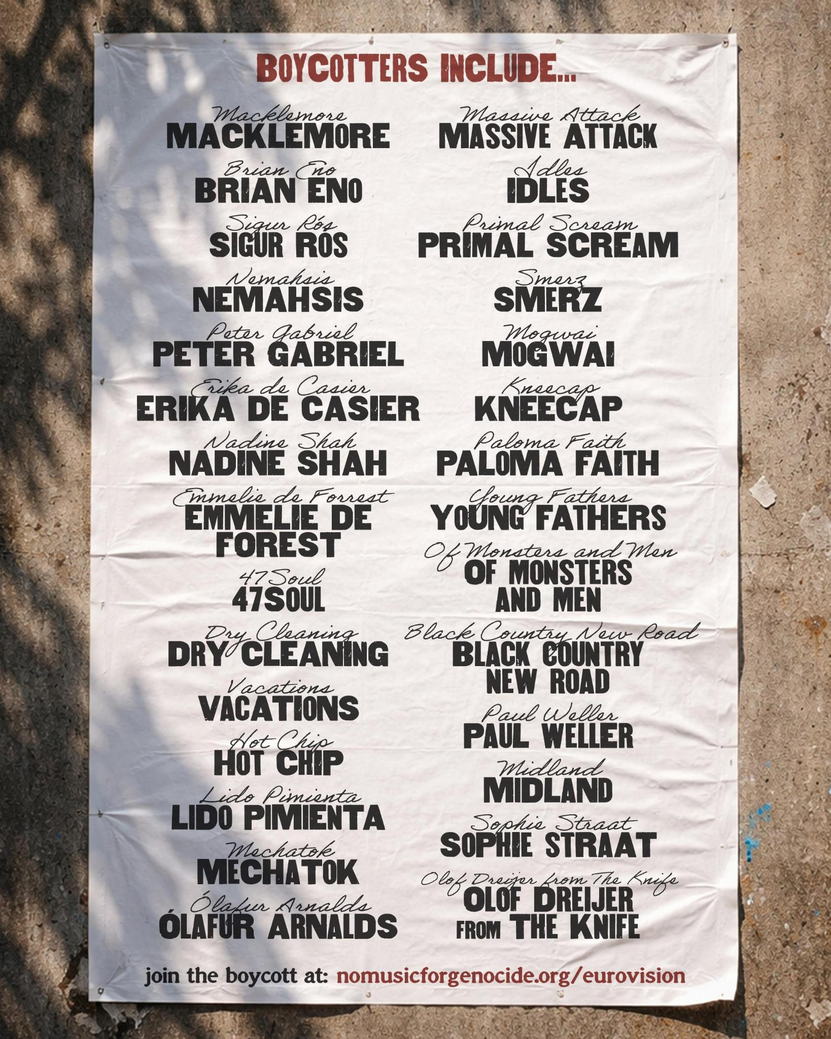 Cultural boycott organizers No Music For Genocide have today issued an open letter calling on fans of Eurovision to boycott this year’s broadcast, with more than 1100 signatories including Massive Attack, Brian Eno, Kneecap, Peter Gabriel, Sigur Rós, Dry Cleaning, Primal Scream, and Black Country New Road. Artists and other cultural workers are encouraged to add their names here.