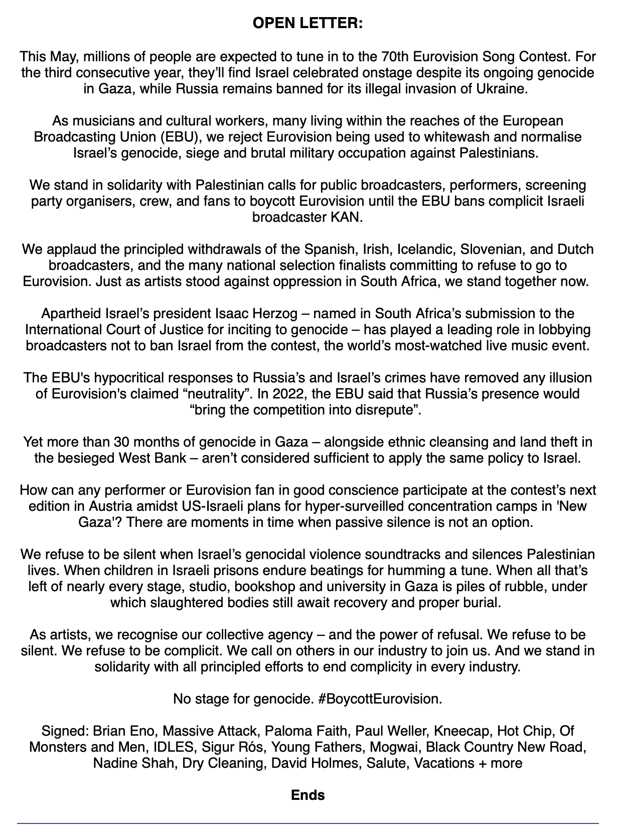 "Russia was banned from Eurovision in 2022. Israel has been murdering Palestinians for decades and is now committing genocide – and for the third year running, they're welcomed back onto the stage. That's not neutrality. That's a choice. We've paid a price for speaking out – lost gigs, court cases, visa bans – and we'd do it all again tomorrow. Silence is complicity. We stand with No Music for Genocide and every artist, fan and broadcaster who refuses to let the world's biggest music event be used to whitewash genocide. No stage for genocide. Free Palestine.”