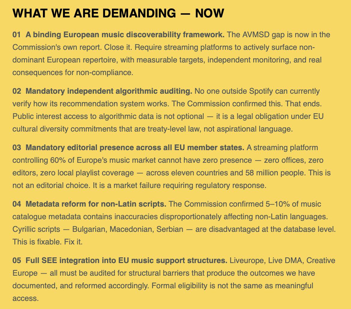 "It controls how 60% of European music listeners discover new artists. It does so through an algorithm the EU Commission has now proven works against smaller markets. It faces no legal obligation to change this. And it operates across our entire region without a single person whose job is to understand our music.