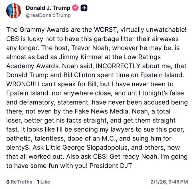 "The Grammy Awards are the WORST, virtually unwatchable! CBS is lucky not to have this garbage litter their airwaves any longer. The host, Trevor Noah, whoever he may be, is almost as bad as Jimmy Kimmel at the Low Ratings Academy Awards. Noah said, INCORRECTLY about me, that Donald Trump and Bill Clinton spent time on Epstein Island. WRONG!!! I can’t speak for Bill, but I have never been to Epstein Island, nor anywhere close, and until tonight’s false and defamatory, statement, have never been accused being there, not even by the Fake News Media. Noah, a total loser, better get his facts straight, and get them straight fast. It looks like I’ll be sending my lawyers to sue this poor, pathetic, talentless, dope of an M.C., and suing him for plenty$. Ask Little George Slopadopolus, and others, how that all worked out. Also ask CBS! Get ready Noah, I’m going to have some fun with you! President DJT"