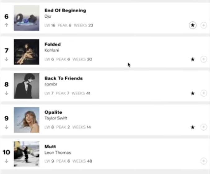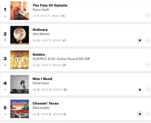 Which leaves us with the No. 1 song, and that's Taylor Swift's "The Fate of Ophelia", one that I do want to revisit for a second. This might have been the case for The Tortured Poets Department, but you guys really have to appreciate the masterful stroke of the Taylor Swift scam with the song going No. 1. And what I mean by that is you have a big single, which, again, to my recollection, is a pretty catchy and well-written song.
