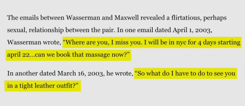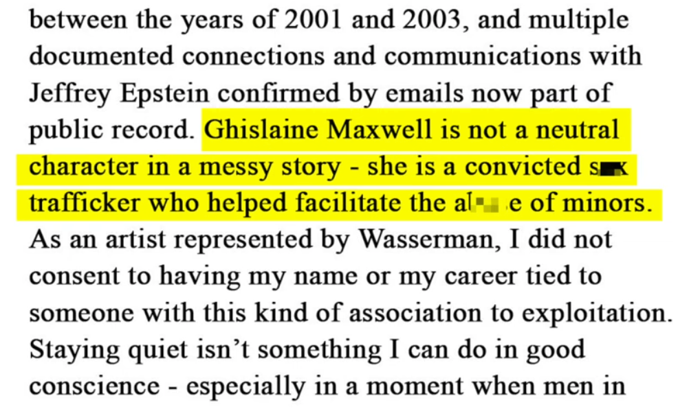 But look, even if Wasserman's connections to this whole thing mostly ended with Ghislaine and whatever relationship he had with her for whatever period of time. As Bethany Cossentino of Best Coast recently cited in a recent statement on this very thing. Ghislaine is not a neutral figure in this.
